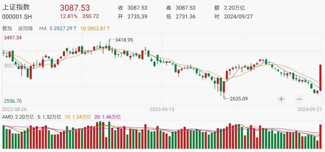 九月二十七日,上证综指收于3087.53点,上涨2.88%。自2008年11月以来,上证综指累计上涨12.81%,近16年来单周上涨幅度最大。。