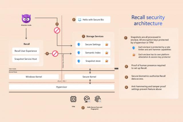 微软强调 Recall 考虑到用户隐私的功能设计,所有敏感数据都经过加密处理,并通过 VBS Enclave 提供一个安全的隔离环境。