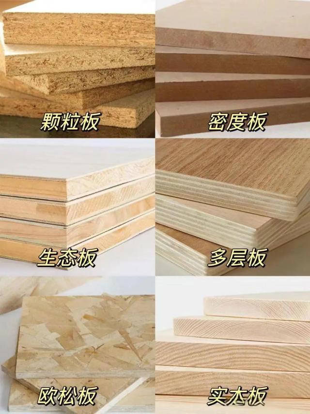 下一步,我们来看看市场上常见的情况。 6 种子板:颗粒板、欧松板、密度板、多层板、生态板、实木板。