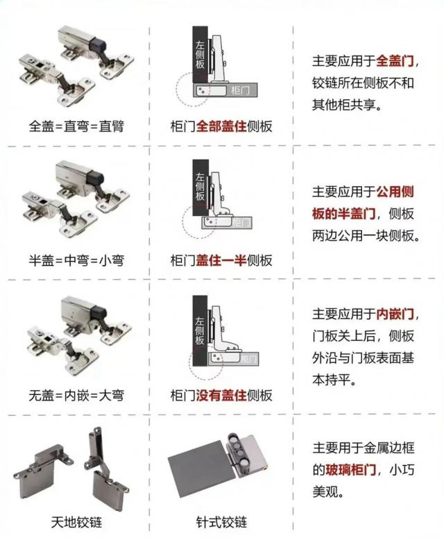 铰链式氛围固定式(适用于不需要二次拆卸的橱柜)和拆卸式(橱柜门可随时拆卸),大家可根据需要购买。