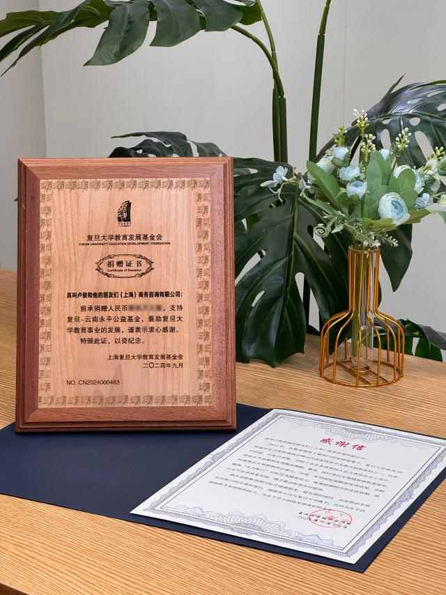 2024 年 9 月 26 下午,卢俊和复旦大学教育发展基金会捐赠颁奖仪式在复旦大学办公楼成功举行。