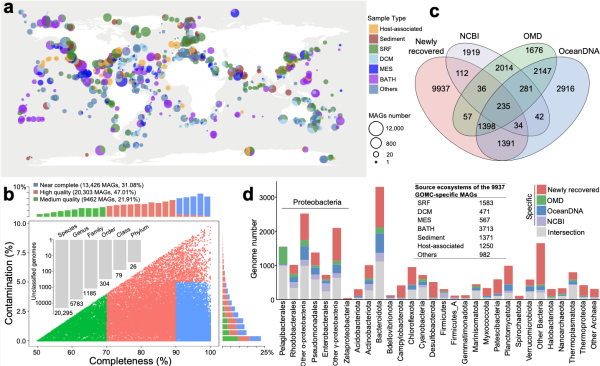 在这项研究中,研究团队持续了五年,通过近240年的公开研究, 重新分析Tb海洋微生物宏基因组信息,构建了海洋微生物组数据库Thee,拥有超过4.31万个海洋微生物基因组和24.58亿个基因序列。 Global Ocean Microbiome Catalogue(GOMC),海洋生态系统包括从南极到北极,从近海到深海,从表面海洋到万米超谷底等多样化。其中,20,000多种微生物是潜在的新发现物种,近10,000种微生物是在深海等独特生物中首次发现的。