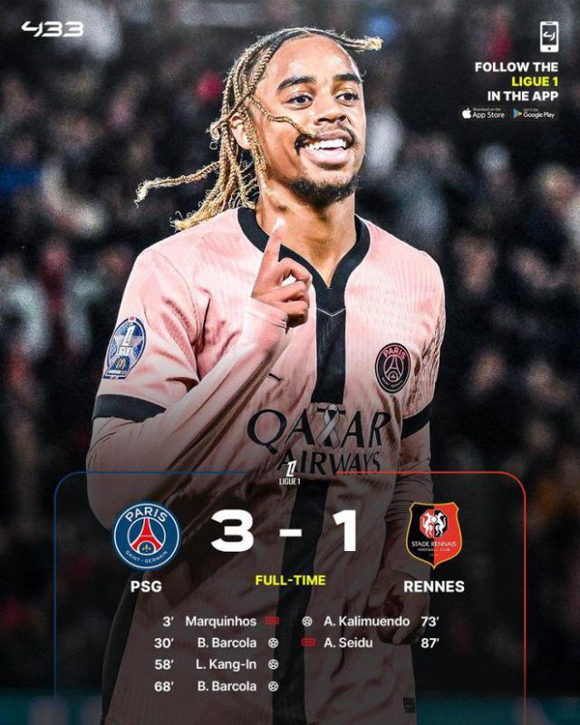 法甲第 6 巴黎圣日耳曼主场轮, 3-1 战胜雷恩,6 轮 20 球。巴尔科拉梅开了两次 中柱,李刚仁补射空门成功,贝拉尔多送点,卡里姆恩多点击破门。