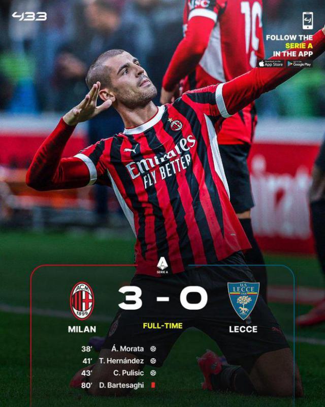意甲第 6 轮,AC 米兰主场 3-0 击败莱切,得到它 3 连赢,先赛 1 追平都灵登顶。莫拉塔破门,特奥传射建功,亚伯拉罕中柱,普利西奇下一个城市,巴特萨基直红。