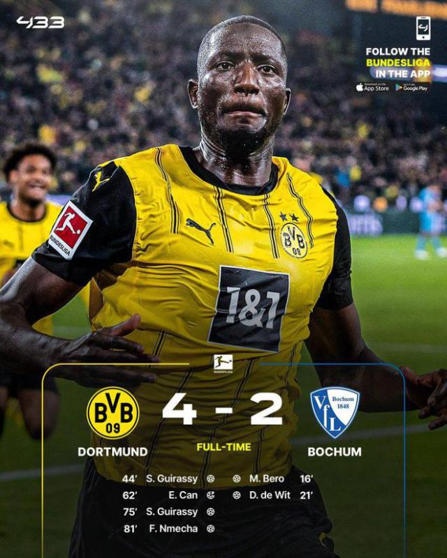 德甲第 5 轮子,多特主场 4-2 逆转波鸿。贝罗首创纪录,德维特扩大领先优势,吉拉西夺回一座城市。吉拉西创造了一个点,埃姆雷 - 詹主罚命中扳平,吉拉西梅开二次反超,恩梅查替补建功。