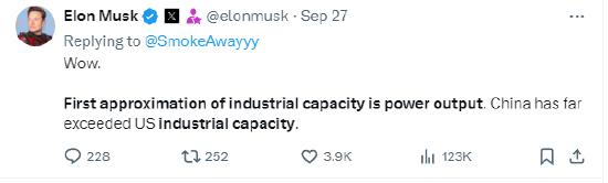 快科技 9 月 28 马斯克最近明确表示,中国的工业生产能力已经远远超过了美国。