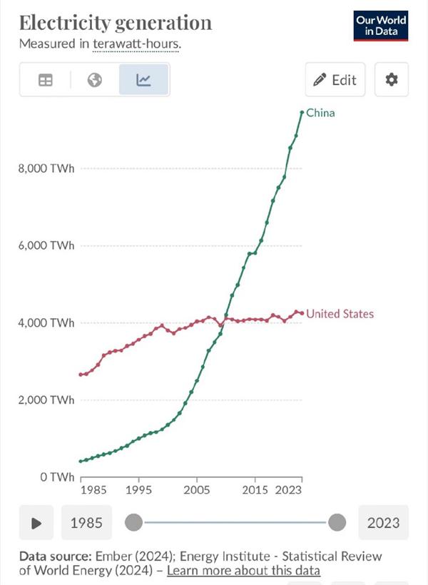 根据 X 根据平台上的信息,马斯克在回复一个客户帖子时发表了这条评论。用户分享的图片显示,根据能源研究所《世界能源统计年鉴》(2024年 年版)数据,2005 2008年后不久,中国的发电量超过了美国,呈直线上升趋势。 2023 每年都远远超过美国。