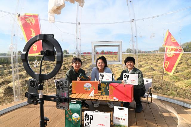 9 月 24 日本,宁安市玄武湖大米专业合作社销售经理陈雨佳(右)在位于上官地村的大米公园与村民通过直播带货推广农产品。新华社记者 王松 摄