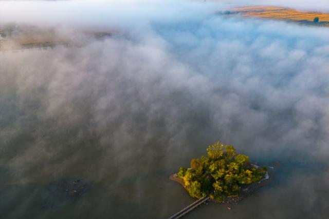 9 月 26 日本,玄武湖被晨雾覆盖,若隐若现(无人机照片)。新华社记者 张涛 摄