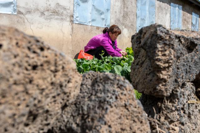 9 月 25 日,在上官地村,村民张丽君在被火山岩层包围的院子里采摘蔬菜。新华社记者 张涛 摄