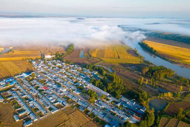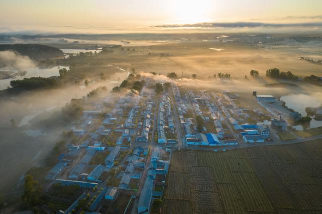 村庄在晨雾中若隐若现。