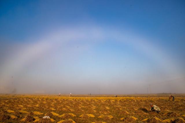 9 月 26 日本,在上官地村的稻田里,村民们在晨雾中收割水稻。新华社记者 张涛 摄