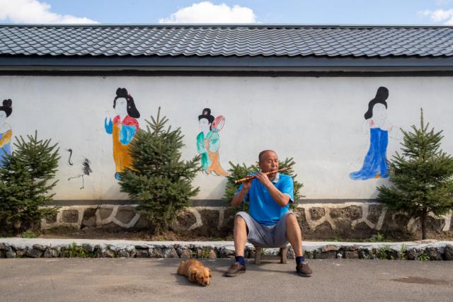 9 月 26 日本,村民们在上官地村吹笛子。新华社记者 张涛 摄
