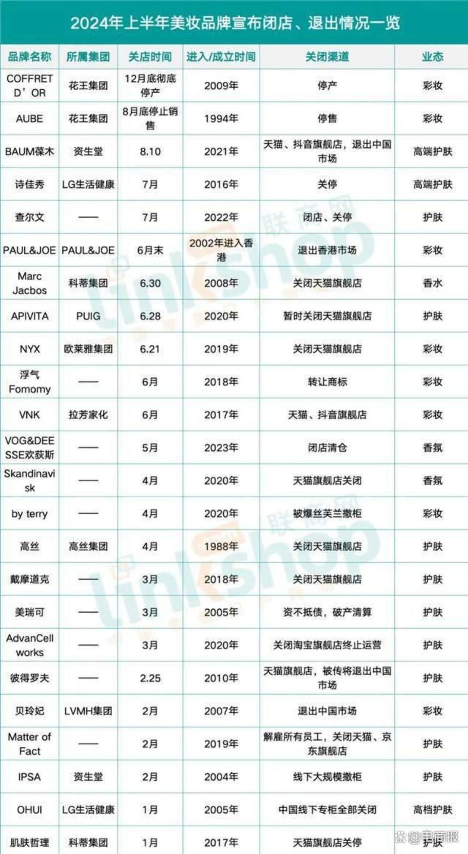 比如越来越多的韩范、日本、欧美美容品牌逐渐退出中国市场。据不完全统计,上半年至少有20多个品牌宣布关闭或退出中国,甚至还有贝玲妃、NYX等。