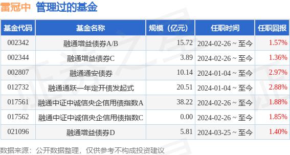 雷冠中先生:中国国藉,经济学硕士,具有基金从业资格。2017 年 7 月至 2023 年 8 每月在汇添富基金管理有限公司工作,担任助理固定收益分析师。2023 年 8 每月加入融通基金管理有限公司。任融合通跃一年定期开放债券型发起型证券基金经理 ( 2024 年 1 月 4 日起至今 ) 融合通安债券型证券投资基金 ( 2024 年 1 月 4 日起至今 ) 。2024 年 2 月 26 日本担任融合增益债券型证券投资基金,融合中证中信央企信用债券指数证券基金经理。