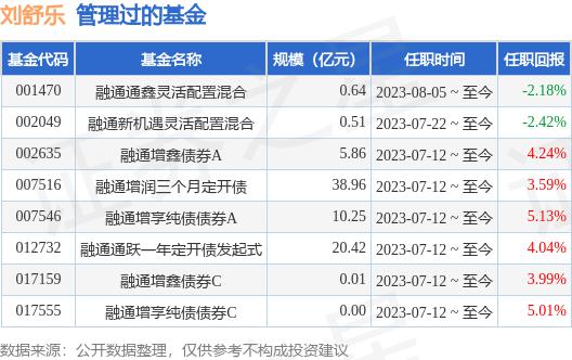 刘舒乐女性:中国国藉,清华大学金融硕士,具有基金从业资格。2016 年 7 每月加入融通基金管理有限公司,担任投资经理。增鑫债券型证券投资基金现任融合基金经理 ( 2023 年 7 月 12 日起至今 ) 、融合增润三个月定期开放债券型发起型证券基金经理 ( 2023 年 7 月 12 日起至今 ) 、融合增享纯债券型证券投资基金基金经理 ( 2023 年 7 月 12 日起至今 ) 、融合通跃一年定期开放债券型发起型证券基金经理 ( 2023 年 7 月 12 日起至今 ) 。融合新机遇,灵活配置混合型证券投资基金经理 ( 2023 年 7 月 22 日起至今 ) 。融合新机遇,灵活配置混合型证券投资基金经理 ( 2023 年 7 月 22 日起至今 ) 。2023 年 8 月 5 日起担任融合通鑫灵活配置混合型证券投资基金主管。2024 年 6 月 19 持有期混合型证券投资基金基金经理日起担任融合稳定增长一年。