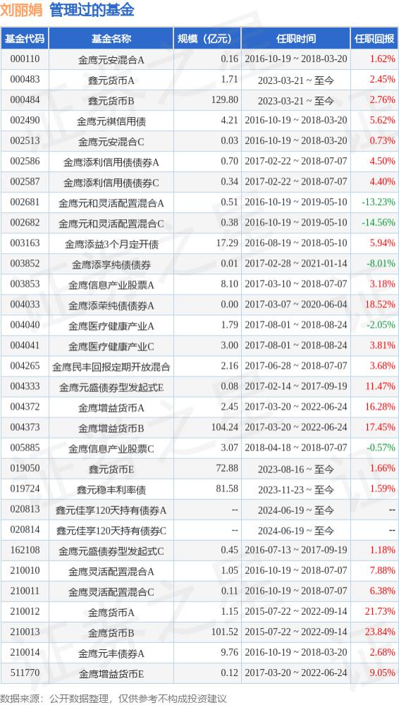 刘丽娟女性:中国国藉,工商管理硕士,相关业务资格:证券基金从业资格。2014年,曾任恒泰证券股份有限公司债券交易员、投资经理、广州证券股份有限公司资产管理总部固定收益投资总监。 年 12 每月加入金鹰基金管理有限公司,曾担任固定收益投资部副总经理、总经理、基金经理。曾任金鹰灵活配置混合型证券投资基金、金鹰元安保本混合型证券投资基金、金鹰元丰保本混合型证券投资基金、金鹰元安保本混合型证券投资基金、金鹰元安保本混合型证券投资基金、金鹰元安保本混合型证券投资基金、金鹰元安保本混合型证券投资基金、金鹰元安保本混合型证券投资基金、金鹰元盛债券发起型证券投资基金、金鹰元盛债券发起型证券投资基金 ( LOF ) 基金经理。曾经是金鹰加荣纯债券型证券投资基金、金鹰现金增益交易型货币市场基金、金鹰金融市场证券基金的基金经理。曾任金鹰加荣纯债券型证券投资基金、金鹰现金增益交易型货币市场基金、金鹰金融市场证券基金基金基金基金基金经理。2022 年 9 每月加入鑫元基金,现任固定收益投资副总监、基金经理。新元货币市场基金、新元稳丰利率债券型证券投资基金现任基金经理。2024 年 06 月 28 日起担任新元合享纯债券型证券投资基金、新元安新宝货币市场基金、新元合丰纯债券型证券投资基金经理、新元富利三个月定期开放债券型证券基金经理。现任鑫元佳享 120 天持有期债券型证券投资基金,新元中证同业存单 AAA 指数 7 天空持有期证券基金的基金经理。