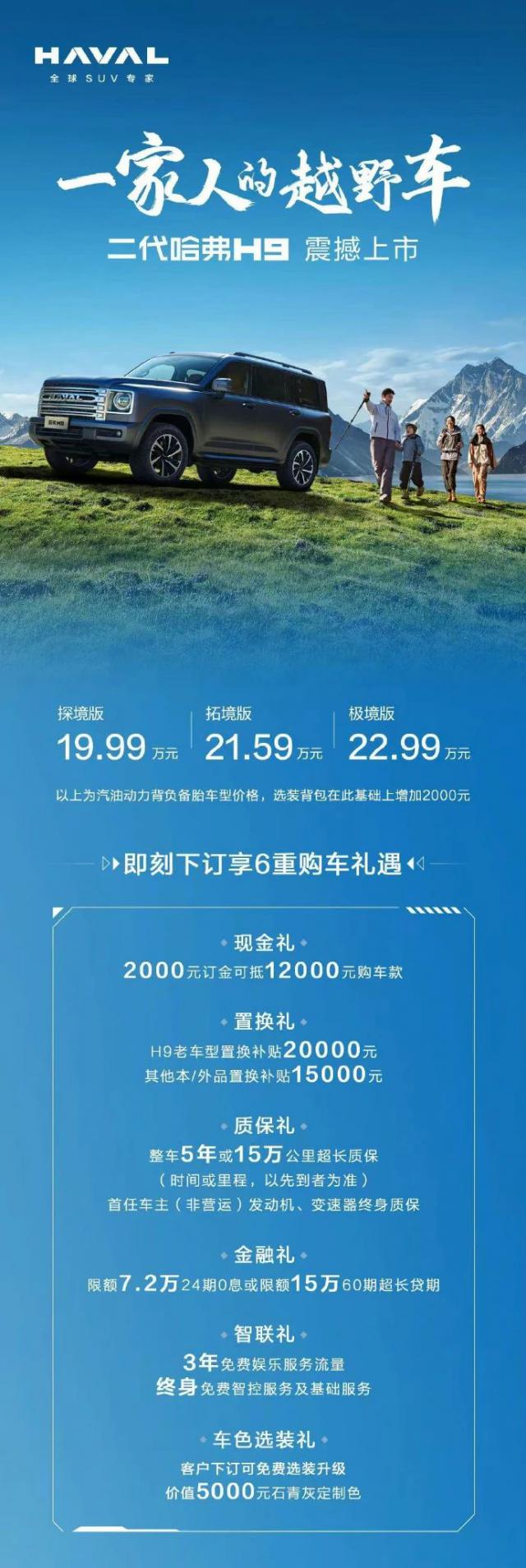 最后余老师也同意了我的想法,的确有一辆车能满足既家又越野的需要,那就是二代哈弗。 H9,而现在它的上市价格还不到 20 一万元,还有更多的优惠政策,比如:无以上的置换补贴 2 万元,发动机和变速器终身保修,2 年 0 等一下,心动不如行动,赶快到店里去了解一下吧!
