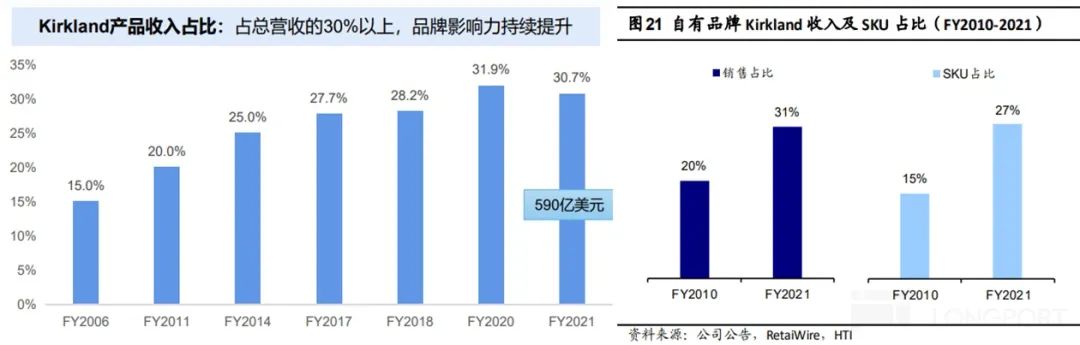 纵观各种零售渠道(不仅仅是超市),推出自贴牌/自主品牌商品可谓普遍经营,Costco 当然也不例外。自贴牌商品的好处包括:① 能降低供应链级别,从而降低后端生成成本和前端价格;② 在一定程度上,自主品牌商品也解决了零售渠道商品同质化的问题,缓解了” “我有人也有” 同质化问题,有利于用户粘性。就结果而言,Costco 自主品牌 Kirkland 所占的收入和 SKU 比重都已在 30% 上下。从绝对的角度看,Costco 自贴牌商品的效果还算不错。