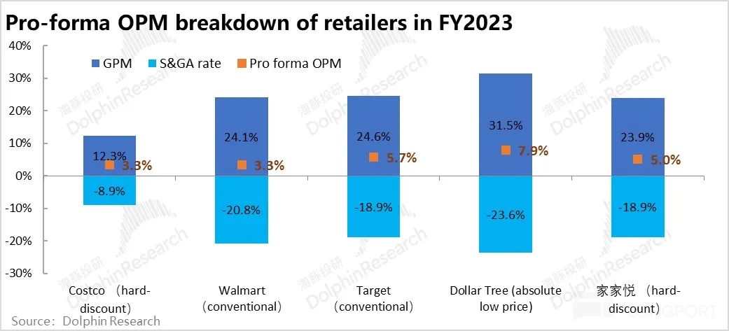 像往常一样,先从结果的角度考虑, 23 财年为例,Costco在毛利率仅 10% 出头 (低于同行 10~20pct 限制),经营 费率 只占收入的比例 8.9%,而典型竞争者的运营费率至少在于 19% 以上。凭着 于 低利润匹配的低利率,Costco 运营利润率略高于 3%。