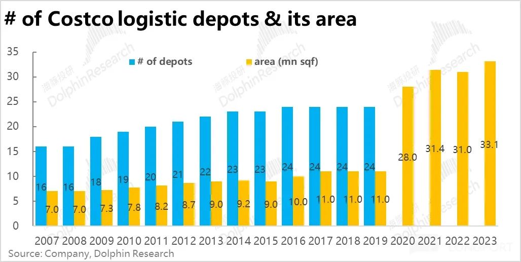 在 07 年~19 在这些年里,可以看到 Costco 配送中心和面积都有可能增加近一点。 60%,这与同期相同 Costco 门店数量从 488 家增长到 783 家约 60% 增长接近,换句话说,新增加的配送中心和新开店的节奏几乎是 1:1 匹配的,到目前为止,还没有像海豚投研期待的那样,履约中心的增长速度比商店的增长慢。也可以见 Costco 单个配送中心的工作量并没有被追求来稀释成本。