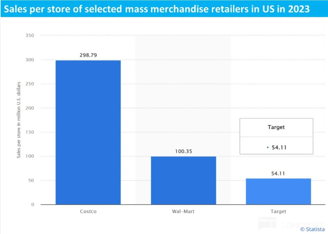 当人均消费金额实际上差别不大时,商店的销售额却有数倍的差别,合理的解释只能是 - Costco 单店服务的用户数量明显高于其它同行,按数据计算大约是 Walmart 和 Target 的 2~3x。