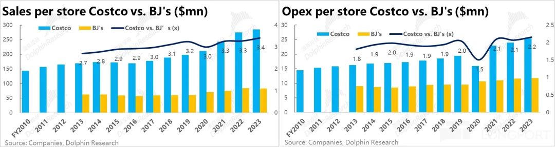 我们在上面的图片中进行了比较 Costco 与 BJ‘s wholesale(一家以北美市场为主, “纯血” 会员量贩超市,属和和和, Costco 最相似的检查目标之一)商店的收入和运营成本。能看到Costco 商店平均经营费用在哪里? 23 财年超出$2500 万,BJ’s 商店的经营费用大约是$840 万,Costco 商店的经营费用是 BJ‘s 的 2.2x,肯定的方面显然不低反而更高。而且 Costco 和 BJ‘s 商店面积差不多(都在 10000 平以上),BJ’s 的 SKU 数量也高于 Costco,看得见也不是因为 BJ‘s 由于门店面积小,或者供应重量小,导致门店运营成本低。