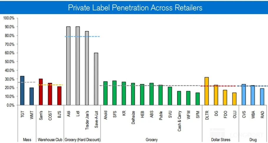 但是相对来说,跨越各种零售行业(包括大众超市、会员折扣、10 元店、药店等),Costco 约 30% 自贴牌商品的比例只能算是一般水平。相比之下 Aldi 自贴牌商品所占比例高达 70%~80% 上下。因此 Costco 自贴牌商品看起来并没有什么明显的优点。