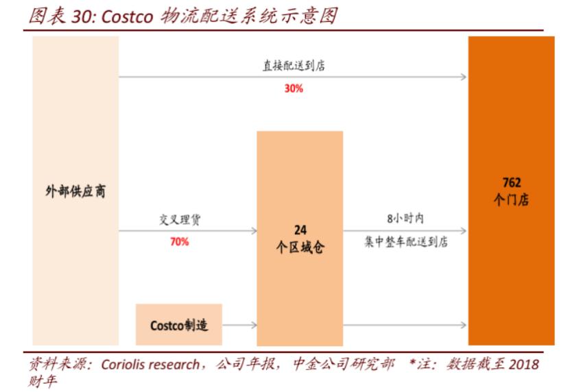并且为进一步降低供应链和运输成本&成本,Costco 专门建立配套的物流配送系统。如图所示,Costco 在所有商品中只有约定 30% 产品(可能对时效性要求较高)直接配送到 800 家里的终端店,占 70% 供应是先集中配送到约约。 20 在多个区域仓库之后,集中配送到终端商店。抽象的说法,从而使配送复杂性 800 量级被压缩到了 20 ,从而降低配送成本。