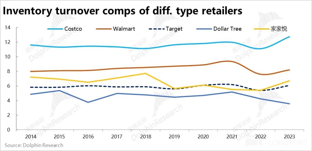 更加直截了当地说,Costco 远远低于同行,只有 4000 左右的 SKU 从逻辑上来说,分子端所需的管理成本相对较低(如果需要对接的供应商数量应该较少,储存和运输货物的差异应该较少),同时分母端门店的销售也应该较少。 2~3x 在同行中,两者共振下体现出来。 Costco 明显的商品采购供应链效率和摊薄后的成本优势。