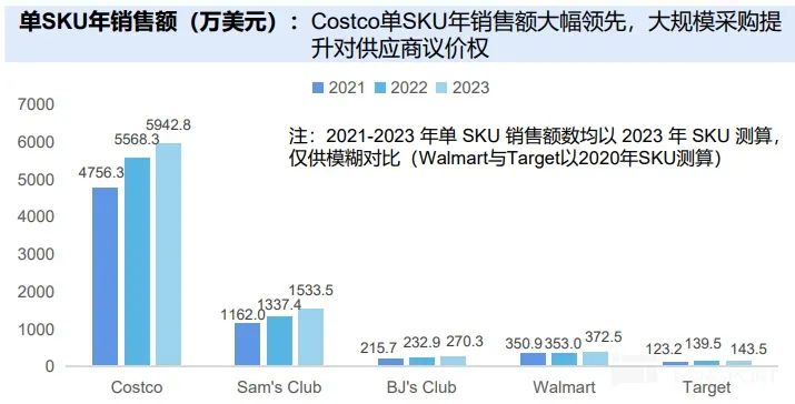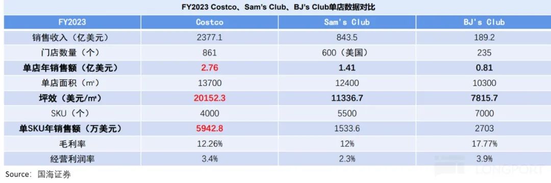 从结果的角度,可以看出 Costco 与其他头部线下商超相比,运营费用率(占收入比例)可以较低。 10pct。所以造成这种不算小的费用差距的具体原因是什么?从逻辑上讲,从分母和分子的角度来看,低成本率一方面可能是因为绝对的效率优势,即同一家店的运营成本可以更低;另一种可能是绝对成本可能不低,但是被强大的销售稀释了。