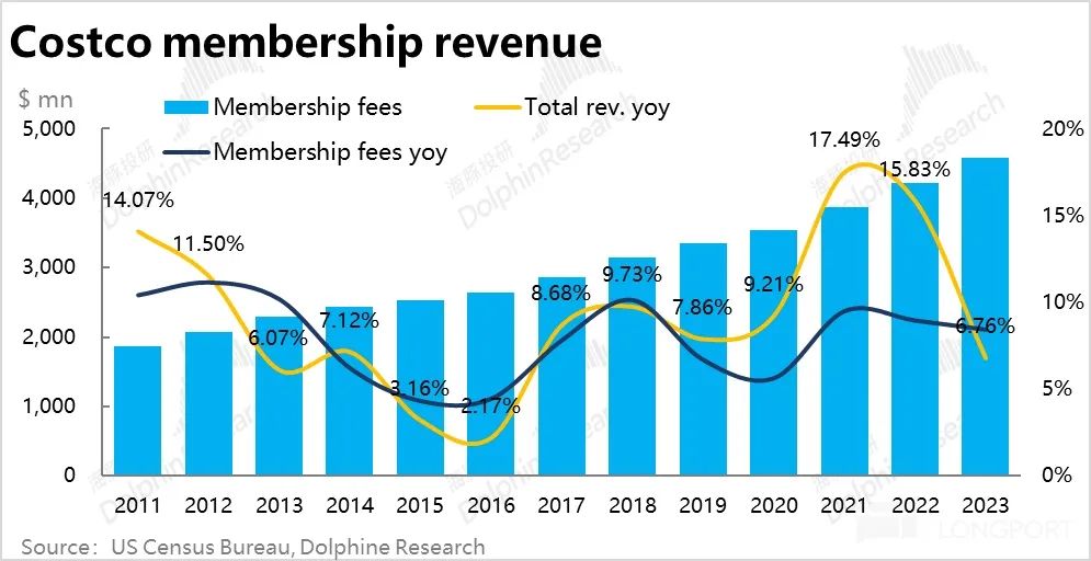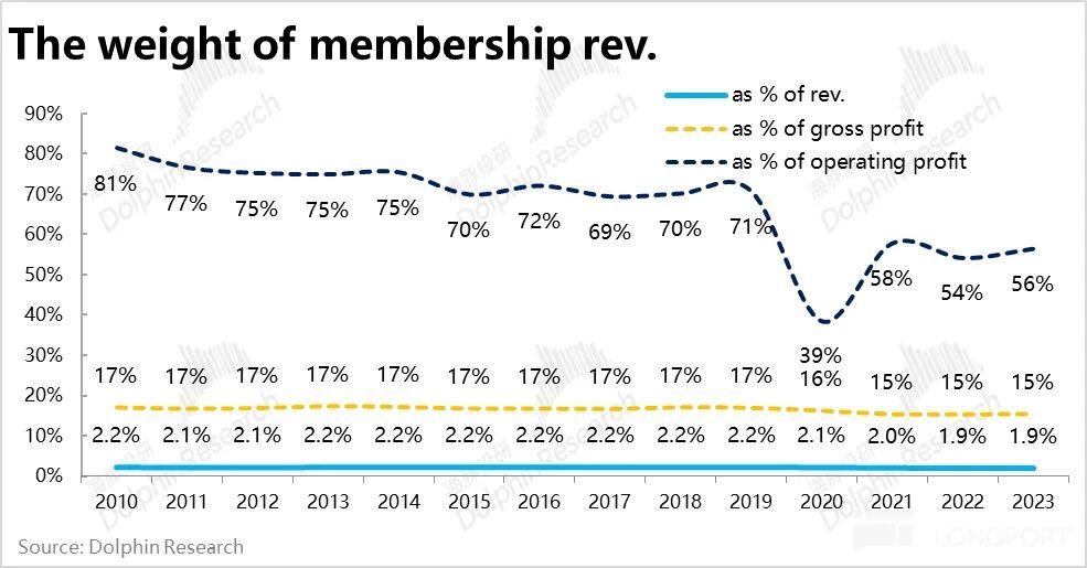 从利润奉献的比例来看,2010 在时代,会费收益曾经占据了总经营利润 7~8 是的,但是趋势一直在慢慢下降。,疫情过后,比例大幅下降。 5~6 成左右。但是,与市场上的一些观点不同,认为会费收益就是 Costco 海豚投研认为,盈利主力的观点是这一观点。 “舍本逐末”。从毛利率的角度看,会费奉献约 15%~17% 更加准确地反映了会费收益在利润方面的重要性,零售业务本身才是真正的关键。