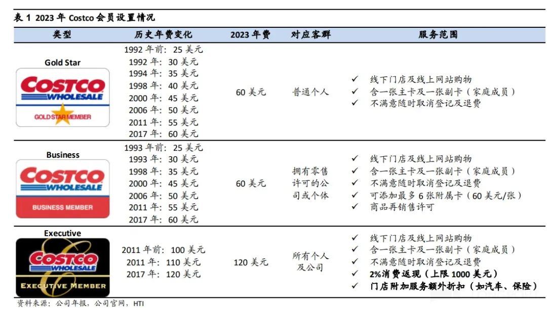 如图所示,Costco 采用三档会员制度,通俗地说就是三档会员制度, “普通会员”、“公司会员”、“VIP 会员三档,目前各自每年收取$60/$60/$120。 会费。从历史上看,每隔几年就会有一次会费上涨,但幅度不大(每次涨价5~$10)。