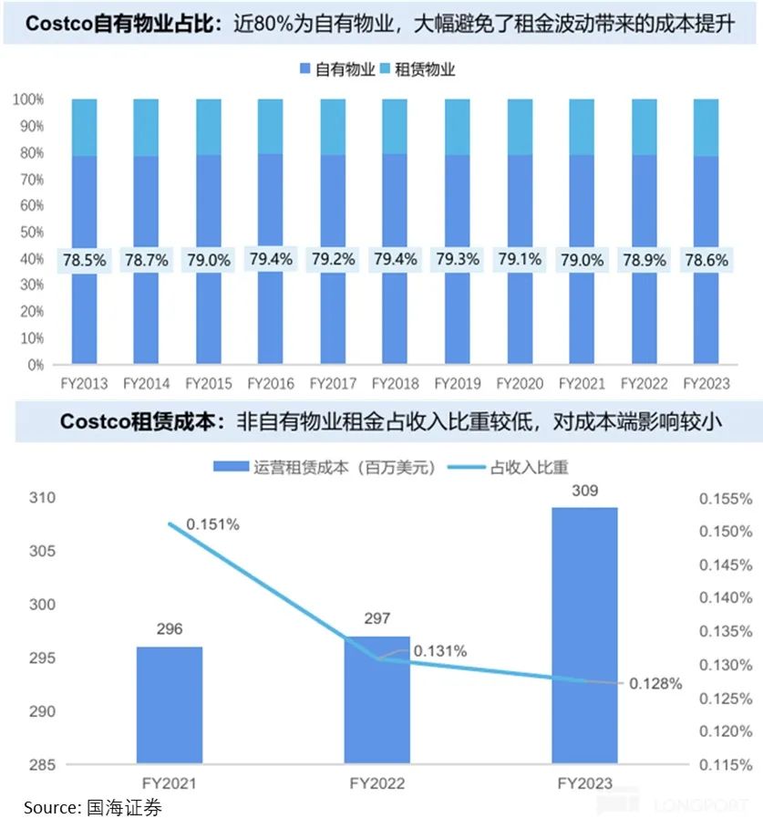 与轻资产模式相比,通过租赁模式可以迅速扩大和减轻前期资金投入的压力,Costco 然后逆势选择把方式做重,一如既往地追求稳定而不是快速。但是Costco 大多数物业都是自有的,也大大减少了企业受到时间和通货膨胀增加的店面租赁成本的影响。根据企业披露,Costco 租赁费用仅占收入的不足。 0.15%,相比之下,普通超市的约定 15%~20% 在总经营费用中,店面租赁费用一般占比较低的%(例如 2%~5%)。换言之,自有物业折旧期过后,仅店面租赁费用此项,可以为此项, Costco 挤出几个百分点的利润率。