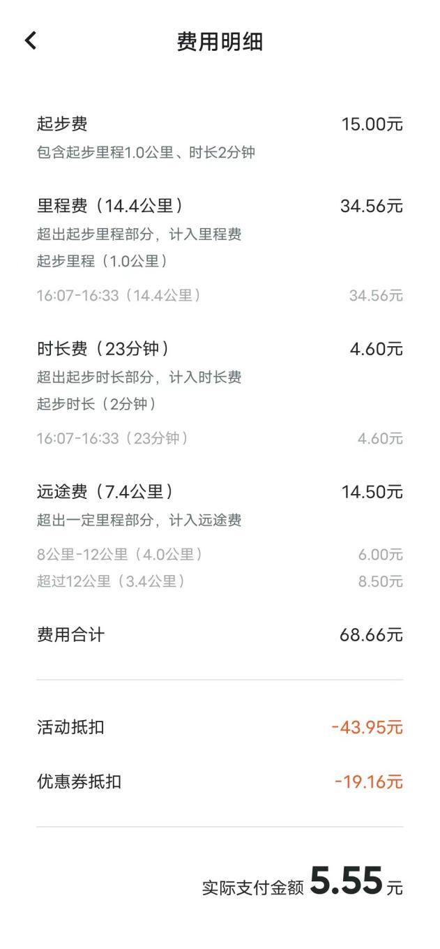 9月13日,青年观察员首先来到洪山区,从武汉市武昌医院(南湖院区)周边的公交车点出发,前往洪山江滩停车场。从预约到上车需要10分钟,整个过程大约需要14公里,到达目的地需要23分钟。因为是新客户,萝卜折扣很大,这次旅行只收5.55元,比其他网车便宜。
