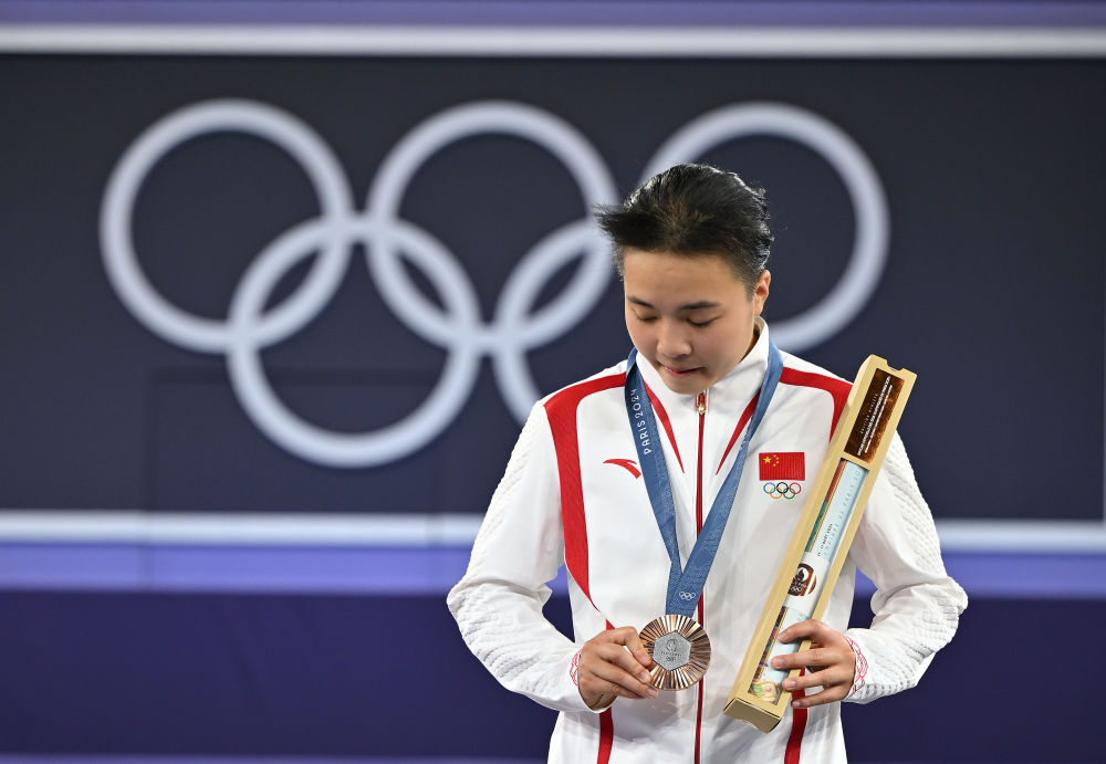 八月九日,在巴黎奥运会霹雳舞女子比赛颁奖典礼上,季军中国选手刘清漪。新华社记者 刘勇贞 摄