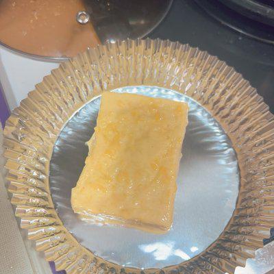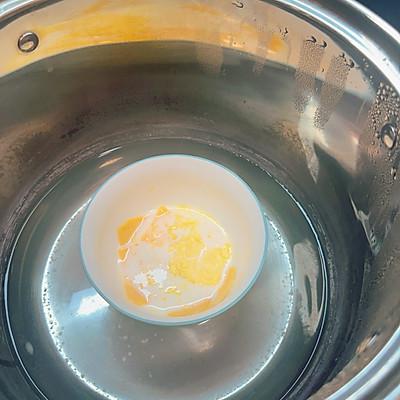 3、一小块黄油,加入一片奶酪片,加入白糖,放入碗中。将碗放入热水锅中,加热搅拌至融化。