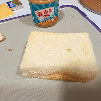 2、第一,切片面包切掉四边,中间可以抹花生酱,不满意的可以不抹,或者抹草莓酱,蓝莓酱都可以。