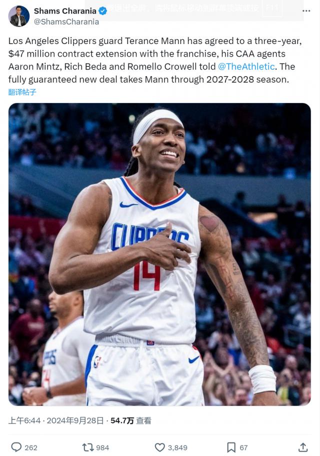 北京时间 9 月 28 日,特伦斯 - 曼恩的经纪人透露,快船队与曼恩签约 3 年 4700 一份万美元的续约合同。没有任何选择的全额保证。2025-26 赛季开始实施,起薪 1550 万美金,2028 夏季合同到期。假如伦纳德没有受伤,曼恩可能不会这么快续约。