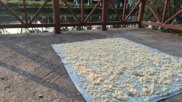我只看到大家都把乌腊蔗皮晾干,但是在石围塘里,晾干的东西并不局限于下面:米饭(还有很多)、蔬菜(倒挂在衣架上)、腊肉(也挂在衣架上)、鞋(晾在窗格上)、被子,衣服,废弃的铝门套。想像一下,在另一个季节,毫无疑问,陈皮,木棉,蛋花和一切都会被晒干。