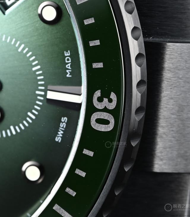 手表采用绿色瓷圈,瓷圈增加液态金属刻度。液态金属刻度是斯沃琪集团的独特技术,宝珀 50 深潜器和欧米茄海马都有。液态金属刻度,耐刮擦,不褪色,有灰色光泽。 50 在深潜器上有拉丝效果。在目前的名表中,表圈刻度材料是最好的。