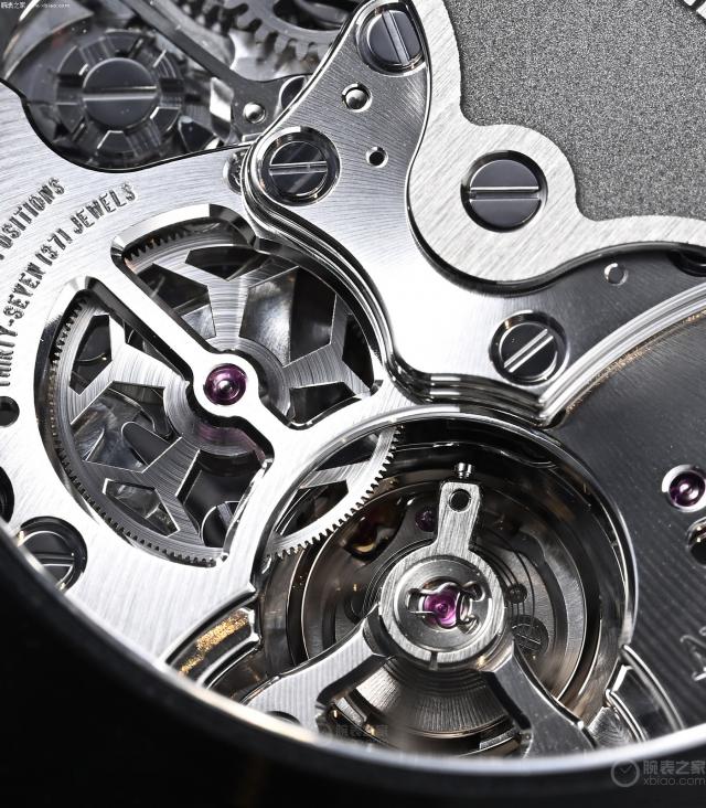 F385在机芯装饰方面 是宝珀一贯的风格。上夹板全部用辐射图案装饰,下夹板用鱼鳞图案覆盖。所有可见和不可见的机芯都被抛光了。机芯夹板倒角抛光。有些夹板是镂空的,可以看到摆陀旁边,运行的秒轮和齿轮也被明显抛光。涂黑的自动陀实际上是 18K 金子。一整块 18K 金色自动陀,材料充足。