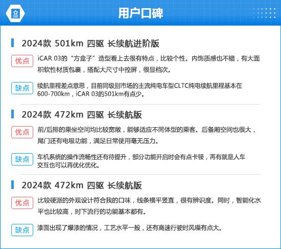 目前,“方盒”造型 SUV 热量持续上升,iCAR 03 采用这种设计,并且凭借其独特的纯电四驱系统,成功地打破了外界对外的关注。 10 万级“方盒”是外观货物的刻板印象。在之前对于 2024 款 iCAR 03 在《100名车主评价新车》的调查中,这款车在动力和空间上广受好评,但也有消费者反映车身附件和电器问题略多,行驶时风噪略大。