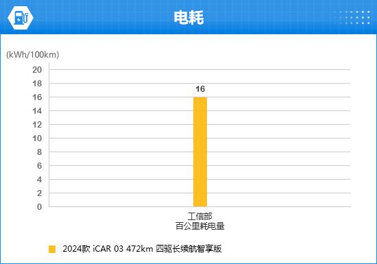 2024 款 iCAR 03 工业和信息化部电耗为 16kWh/100km,因为目前各大网站都没有准确的车耗数据,所以无法整理。