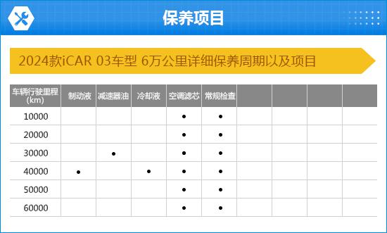 按照维修手册,2024 款 iCAR 03 整车质保为四年或四年。 12 万公里,首个私人客户可享受终身整车保修。 终身三电质保 终身免费救援。保养间隔为 12 个月或 10000 公里(以先去者为准),每公里制动油和冷冻液 2 年或 40000km 更换减速机油首次更换为减速机油。 2 年或 以后每30000公里 3 年或 40000 每公里更换一次。另外,定期的常规维护内容很多,涉及制动系统、轮胎、线路、电驱动系统、动力电池等。