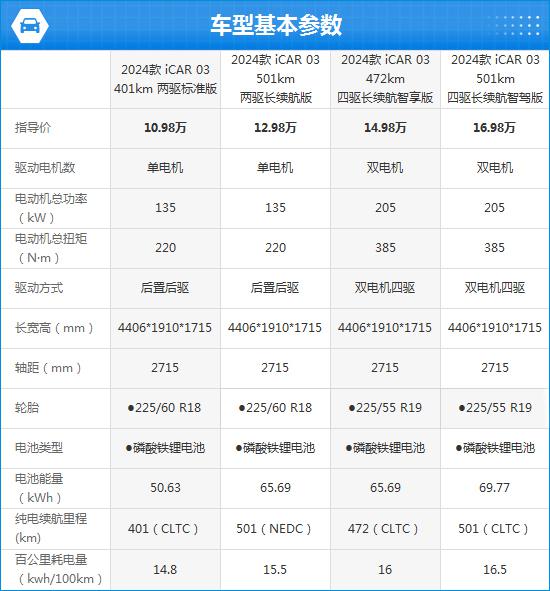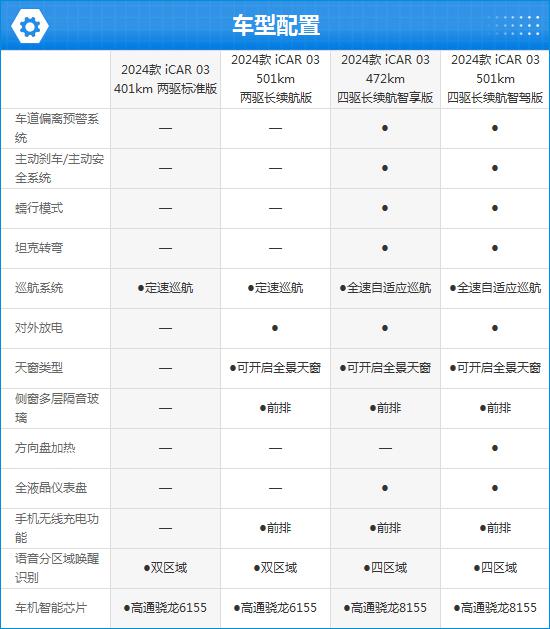 2024 款 iCAR 03 整个系统都配备了纯电动设备,根据配置的不同,可分为后置单电机和双电机四驱两种动力规格。在设备方面,低配车型不仅续航里程短,而且设备性能也比较寒酸,当然这与其低价直接相关。中高端车型整体性能更好,在舒适性、方便性、驾驶辅助功能等方面都有明显的升级,可达到同级别车型的主流水平。