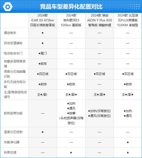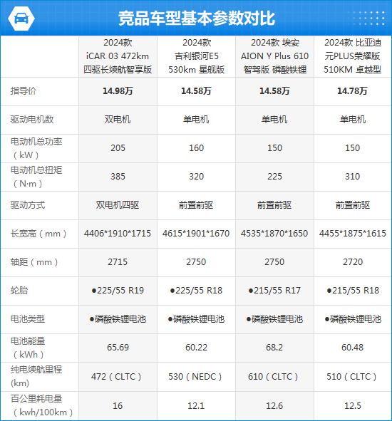 由于同级别的“方盒”造型的纯电车型确实很少,真正可以和 iCAR 03 基本上没有对标车型。最终,吉利银河是根据定位和价格等因素选择的。 E5、埃安 AION Y Plus 和比亚迪元 PLUS 作为竞争产品的荣耀版。相比之下,因为 iCAR 03 采用双电机,动力参数是四款车中最强的,但相应地在续航方面并不占优势。此外,iCAR 03 与其他三款车型相比,它还提供了自动变道辅助和循迹倒车等功能,实用性更好。