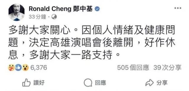 8 月 3 当天,郑中基在社交平台上宣布,高雄演唱会将是最后一场演唱会,之后准备退休休息,调整情绪。