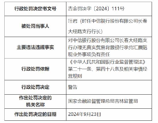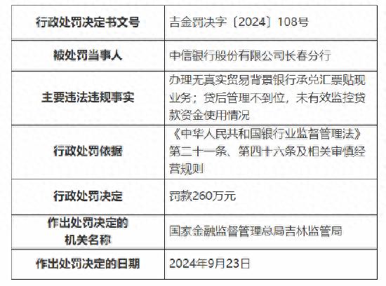 9 月 27 据国家金融监督管理总局吉林监管局行政处罚信息公开表显示,中信银行股份有限公司长春支行因“办理无真实贸易背景银行承兑汇票贴现业务”被国家金融监督管理总局吉林监管局罚款,信贷管理不到位,贷款资金使用没有得到有效监控。 260 万元;