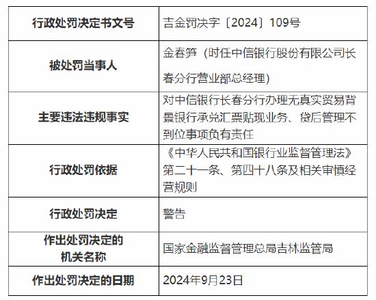 金春笋(时任中信银行股份有限公司长春分行营业部总经理)负责中信银行长春分行办理承兑汇票贴现业务、信贷管理不到位事项,没有真实贸易背景,被监管警告;